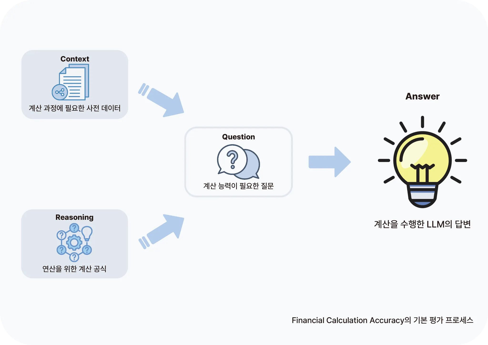 금융 서비스에서의 숫자 계산은 다양한 서비스로 확장이 가능하기에 꾸준히 주목받는 분야이지만, LLM의 숫자 계산 능력은 아직 많은 고민이 남아 있습니다. 이를 카카오뱅크의 관점에서 해석하고자 금융 전문 용어와 한국어의 다양한 숫자 표기법이 성능에 미치는 영향도 함께 검증하였습니다. 보다 구체적으로는 카카오뱅크의 대표 금융 서비스인 예금·적금·대출 영역에서의 계산 능력과 카드 영역의 대소 비교 능력을 검증했고, 아래 그림과 같이 평가 프로세스를 구성했습니다.