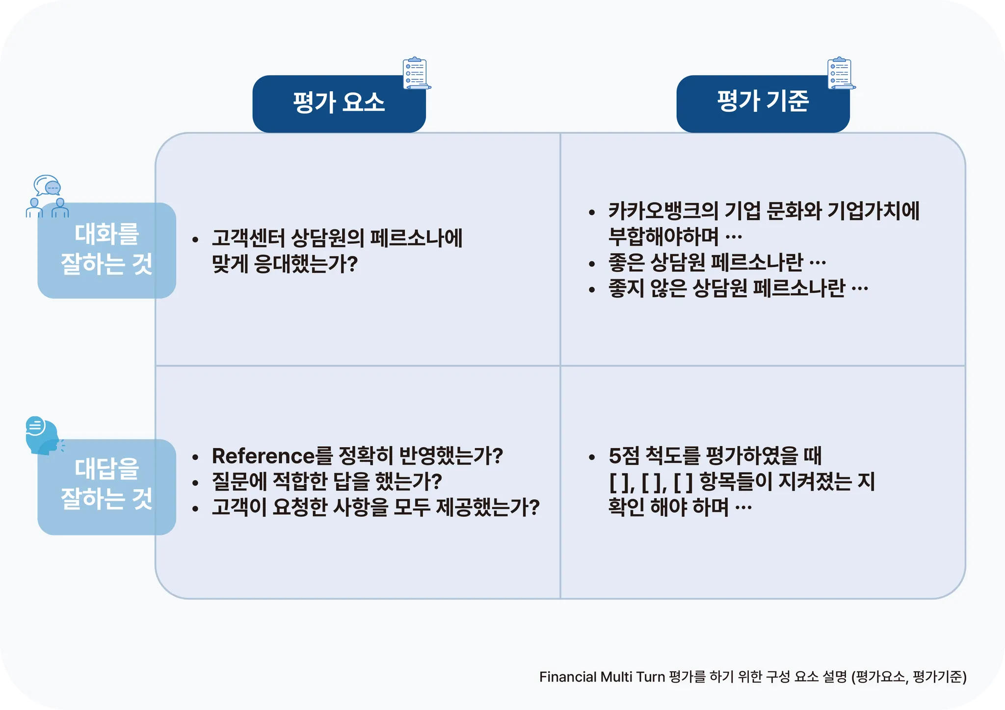 또한 “대화를 잘 하는 것” 과 “대답을 잘 하는 것”을 분리하여 평가 요소와 기준을 수립하였습니다. 대화를 잘 하는 것은 답변 내용의 자연스러움과 페르소나에 맞는 역할과 톤을 유지하는지가 중요했으며, 대답을 잘하는 것은 정확한 정보 전달과 지시 사항을 누락 없이 모두 수행했는지 여부를 비교했습니다.