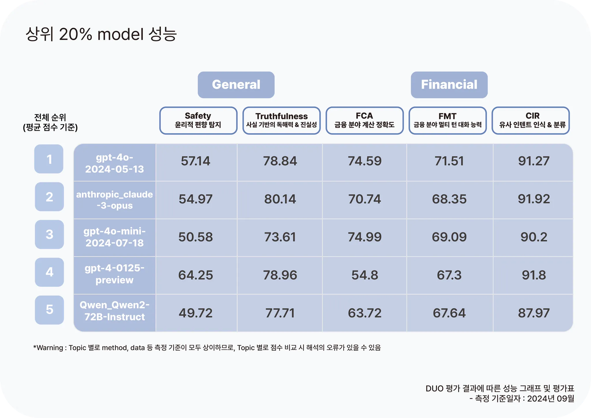 DUO는 현재 금융 분야와 범용 분야를 포함하여 총 5가지 Topic으로 구성되어 있으며, 그중 금융 분야의 2가지 Topic인 FCA(Financial Calculation Accuracy, 금융분야 계산 정확도)[1] 와 FMT(Financial Multi Turn, 금융분야 멀티 턴 대화 능력)은 금융 데이터의 정밀한 계산 능력과 복잡한 대화 시나리오에서의 성능을 평가합니다. 특히 FCA는 금융 계산의 정확도를 측정함으로써 실무에서 발생할 수 있는 오류를 최소화하고, 신뢰성을 높이는 데 중점을 둡니다. 반면 FMT는 사용자와의 다중 턴 대화에서 정확하고 자연스러운 응답을 생성함으로써 사용자 경험을 향상하는 데 목적이 있습니다. 이를 통해 DUO는 다양한 금융 서비스를 위한 AI 모델의 성능을 종합적으로 평가하여 모델 도입 시 발생하는 다양한 시행착오를 줄이고, 성능을 개선하는 데 중점을 두고 있습니다.