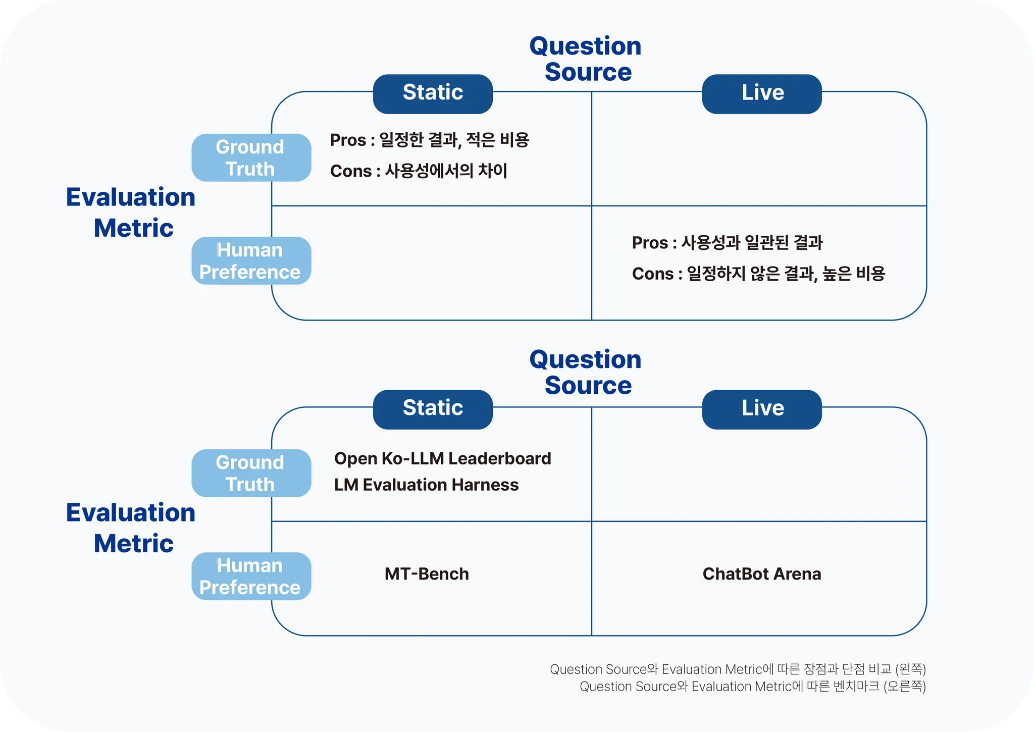 일반적으로 LLM의 성능을 확인하기 위해서는 현재 공개되어 있는 Open Ko-LLM LeaderBoard, LM Evaluation Harness 등의 벤치마크를 활용하여 기준을 수립하는 방법이 있습니다. 이러한 방법은 이미 공개되어 있는 데이터를 이용하기에 쉽고 빠르게 측정이 가능하다는 장점이 있으나, 정답(Ground Truth)이 있는 벤치마크 특성상 서비스에 따라 측정된 성능과 실제 사용성이 다소 차이가 있는 한계가 있습니다. 그렇기 때문에 Chatbot Arena, MT-Bench(Judging LLM-as-a-Judge) 등을 이용해 사람의 선호도(Human Preference)와 유사하게 성능을 측정하여 실제 사용성을 일치시키는 방법을 사용합니다. 하지만 마찬가지로 측정자의 선호에 따라 일관적이지 않은 측정 결과가 출력될 수 있는 등 한계가 존재합니다.