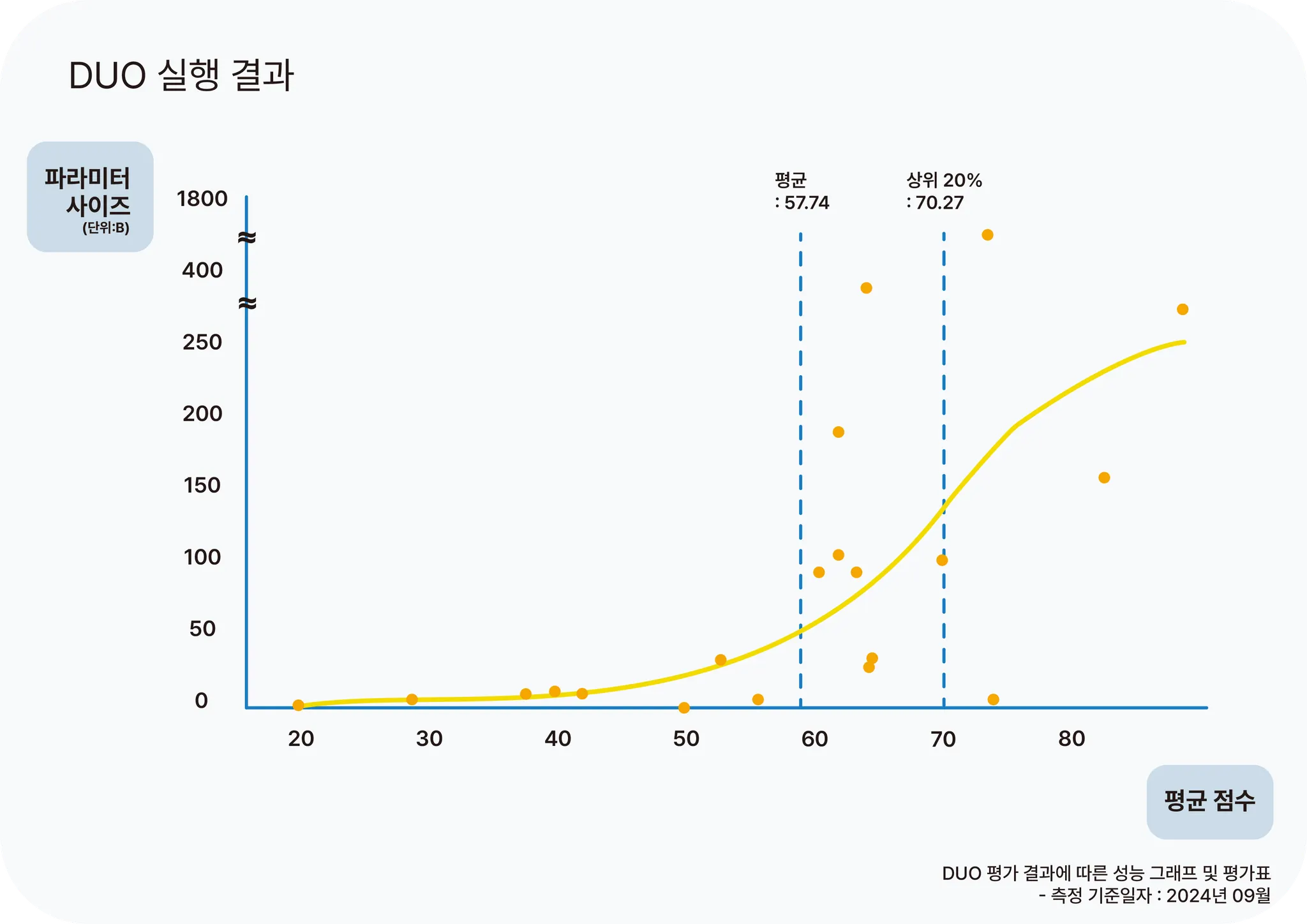이렇게 구축된 5개의 평가 분야(Topic)와 약 30개의 세부 항목(Ability)으로 보편적으로 좋은 성능을 확보한 LLM을 찾기 위해 가장 많이 사용되는 21가지 모델을 평가하였습니다. 또한 성능 측정 결과를 분석 시 “파라미터 사이즈와 성능의 상관성”을 추가적으로 확인하기 위해 파라미터 사이즈와 성능 평균 점수를 시각화하였습니다. 시각화 결과 그래프 상에서 확인되다시피 대체적으로는 파라미터 사이즈와 성능이 양의 상관관계를 보이지만, 평균 점수 이상부터는 다른 경향성을 보여줍니다. 더불어 상위 20% 모델들은 보다 더 다른 경향성을 보여줍니다.