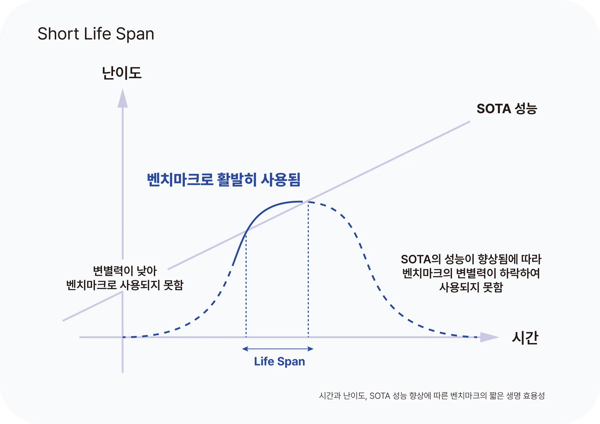 또한 시중에 공개된 벤치마크에는 각 벤치마크 특성마다 고유의 한계뿐만 아니라, "제한된 범위"와 "짧은 수명 주기"라는 공통된 문제도 존재합니다. 특히 SOTA 모델의 성능이 고도화될수록 벤치마크가 너무 어렵지도, 너무 쉽지도 않아야 하는 특성 때문에 그 수명이 매우 짧아집니다. 짧은 수명은 최신 모델의 평가와 비교를 위해 지속적으로 새로운 벤치마크가 필요하다는 것을 의미하며, 벤치마크를 설계하고 유지하는 데 더 많은 시간과 자원이 필요합니다. 따라서 더 지속 가능하고 포괄적인 벤치마크를 개발하는 것이 중요한 과제로 떠오릅니다.