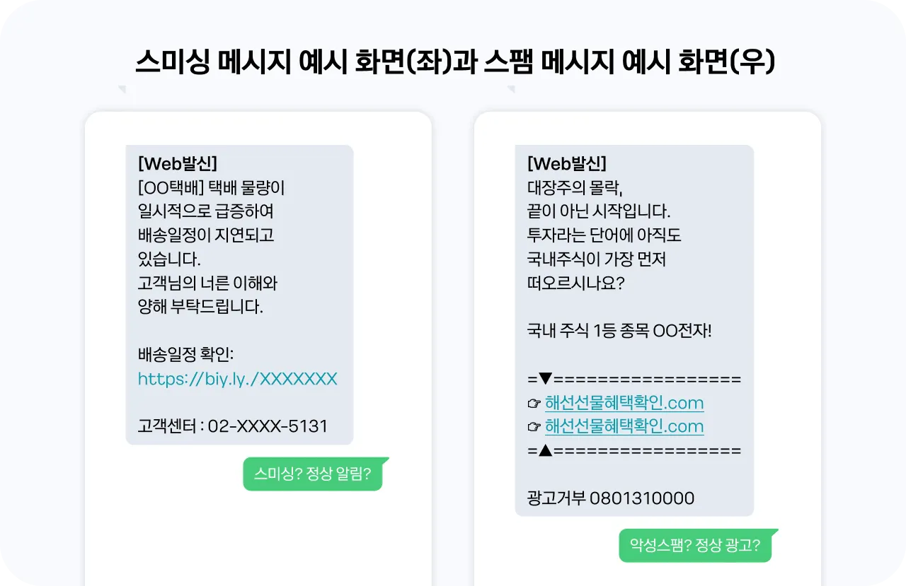 탐지 정확도를 보완하는 과정에서 정상적인 광고성 문자와 불법 스팸 문자(불특정 다수에 대량으로 전송되는 메시지) 구분이 중요해졌습니다. 특히, 광고 문자는 정상적인 마케팅 활동을 포함하고 있어서 유형과 범위가 훨씬 다양합니다. 반면, 명확한 수신 동의 없이 무차별하게 전송되는 악성 스팸 문자는 비합법적인 내용을 포함하고 있는 경우가 대부분이라 스미싱과 유해도가 비슷하다고 볼 수 있습니다. 이러한 상황을 반영해 고객에게 더 유익한 서비스가 될 수 있도록, 탐지 대상에 불법 스팸 문자를 포함시켜 스미싱 범위를 재정의 했습니다.