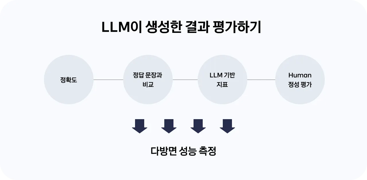 일반적으로 알려진 유사도 기법(두 개의 데이터 포인트 간의 유사성을 측정하는 방법. 주로 자연어 처리 분야에서 사용되며, 텍스트 요약 및 번역 품질을 평가하는 데 활용됨. BLEU, ROUGE, BertScore 등의 기법이 있음)을 활용하여 생성된 문장을 정답 문장과 비교하여 평가했습니다. 이외에도 논리성, 일관성, 유용성, 형식 준수 등을 구체적으로 정의하고 외부 LLM으로 수치화하는 절차도 추가했습니다. 자동화된 평가 수치를 보완하기 위하여 평가자 2명이 직접 정성평가를 수행하고, 평가결과의 신뢰성을 담보하기 위하여 평가결과 일치여부를 검증하였습니다.