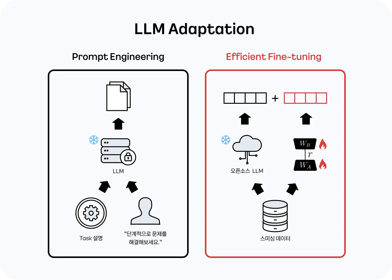 스미싱 탐지의 핵심인 자체 LLM은 성능과 비용 양 측면을 모두 챙길 수 있는 LLM 최적화(Adaptation)를 통해 개발되었습니다. 무엇보다 월간활성이용자수(MAU) 1,800만이 넘는 카카오뱅크 앱 환경에 맞게 수준 높은 성능 뿐만 아니라, 효율적인 자원 관리와 빠른 서비스 응답속도를 확보해야 했습니다. 이를 위해 한국어에 능통한 LLM을 선택 후, 자체 데이터로 핵심 파라미터를 선별해 업데이트 하는 효율적인 접근법(Efficient Fine-tuning)을 시도했습니다.