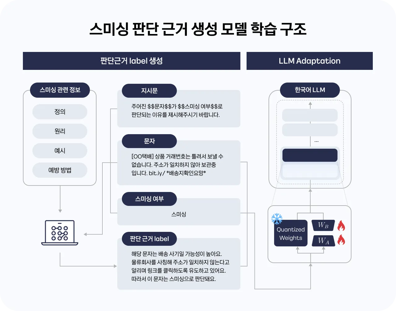 초기 학습 데이터는 크라우드 소싱, 구매, 직접 수집 등 여러 방법을 병행해서 구축했으며 과적합(Overfitting)을 유발하는 유사 데이터는 제거해서 정제했습니다. 메시지를 스미싱으로 판단하는 근거는 스미싱 정의, 원리, 예시, 예방 방법 등을 상세하게 담은 지시문을 별도 LLM에 프롬프트로 입력하여 생성하도록 하는 Pseudo Labeling(준지도 학습(Semi-supervised learning)을 위한 세부 기법 중 하나로, 레이블이 없는 데이터에 대해 모델이 예측한 결과를 마치 실제 레이블인 것처럼 활용하여 모델을 다시 학습시키는 방법)을 수행했습니다. LLM 파라미터 업데이트는 4비트로 모델을 경량화 한 상태에서, 주요 연산 모듈(Attention) 일부 레이어에 매우 적은 양의 추가 파라미터를 학습하는 방식을 적용했습니다.
