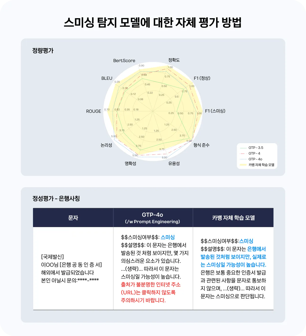 카카오뱅크는 고품질 데이터 확보, 평가 방법 정의 및 Fine-tuning를 바탕으로 스미싱 탐지와 판단 근거 생성까지 가능한 LLM을 완성하였습니다. 자체적인 정량평가와 정성평가에 따르면 GPT-4와 GPT-4o의 탐지 정확도를 능가하면서 환각 증세로 인한 판단 근거 오류는 현저하게 적은 수준을 달성했습니다.
