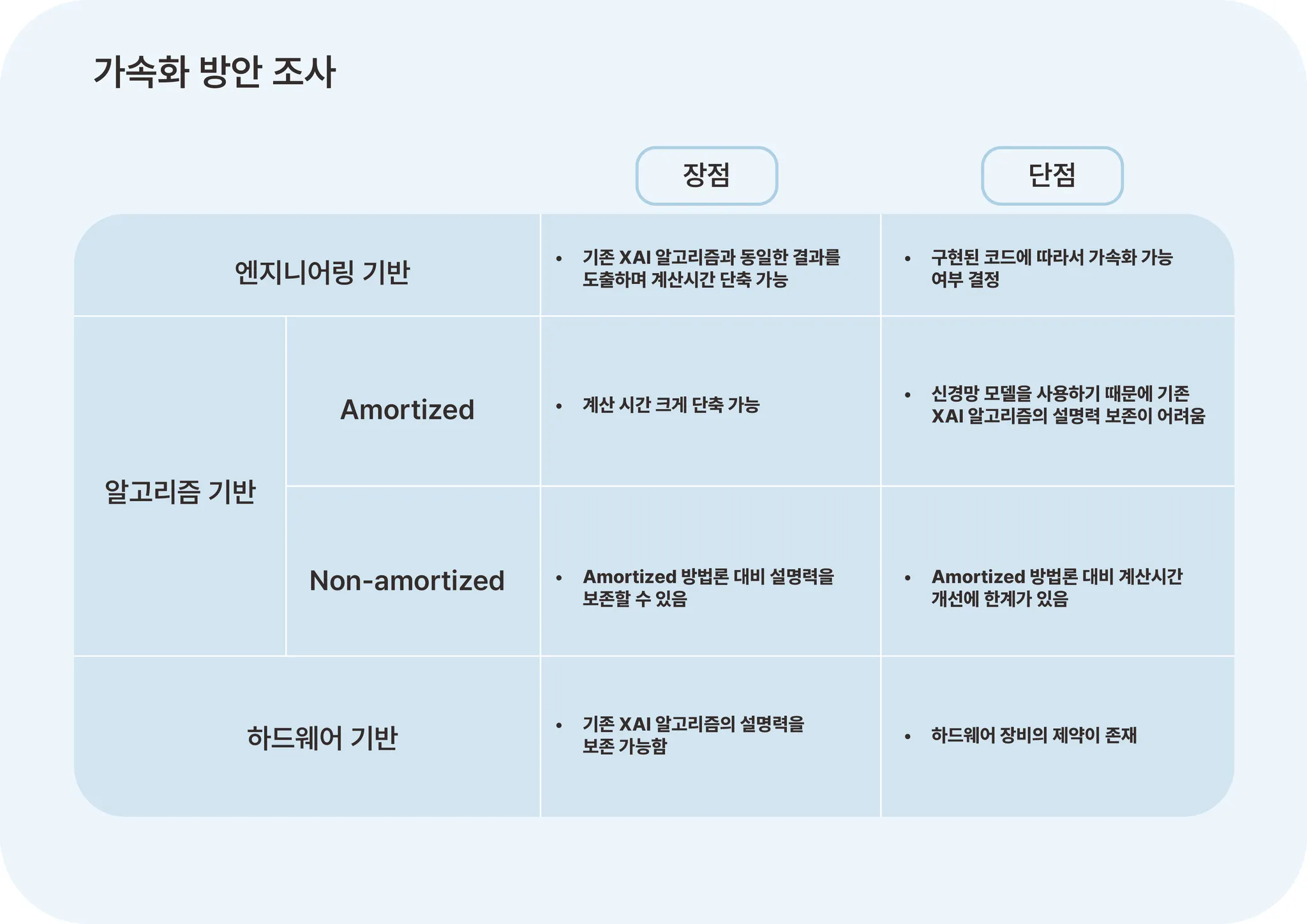 금융기술연구소는 XAI 알고리즘의 실용화를 위해 기존 XAI 알고리즘의 정확도를 최대한 유지하면서 속도를 향상시키는 방법론을 개발했습니다. 이를 위해 기존 대표 알고리즘들을 평가할 지표를 선정해 개발 방향을 정했습니다. 우선, XAI 알고리즘 가속화 연구는 크게 엔지니어링 기반, 알고리즘 기반, 하드웨어 기반 세 가지로 나눌 수 있습니다.