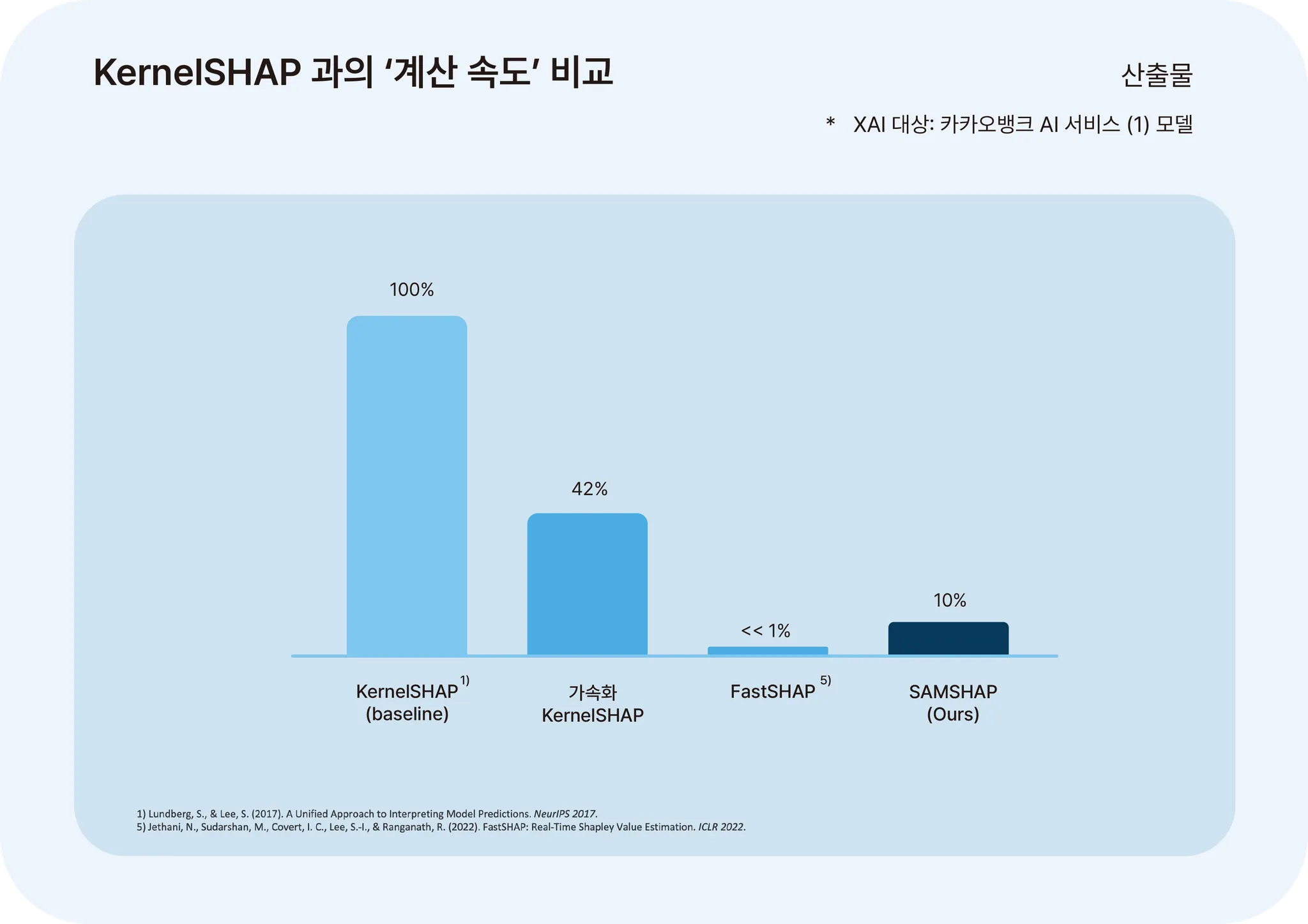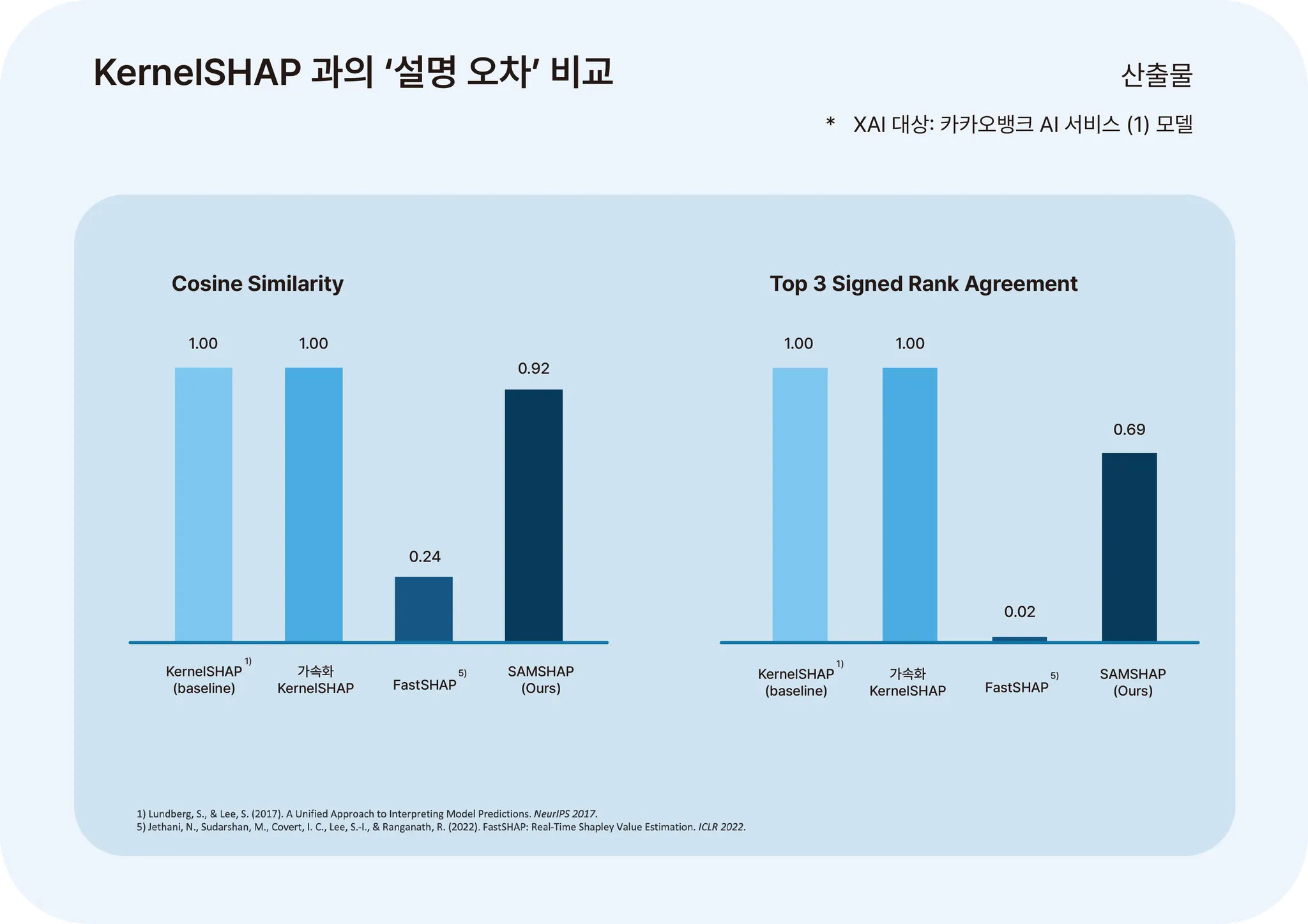 개발된 두 가속화 XAI 알고리즘을 가지고 실제 서비스에 활용중인 카카오뱅크 AI 모델에 대한 결과를 비교 및 평가했습니다. 기존 XAI 알고리즘인 KernelSHAP과 비교했을 때, 엔지니어링 기반의 가속화된 KernelSHAP은 42% 속도 개선을 보였으며, 설명 결과의 정확도를 100%로 유지한 것을 확인할 수 있습니다. SAMSHAP의 경우에는 KernelSHAP대비 최대 10배 속도 향상을 보였으며, 정확도 측면에서는 KernelSHAP의 설명결과를 Cosine Similarity 기준으로는 92%, Top-3 SRA 기준으로 69% 보존한 것을 확인할 수 있습니다. 이는 계산속도가 빠른 FastSHAP 대비 우수한 설명력을 입증할 수 있습니다.
