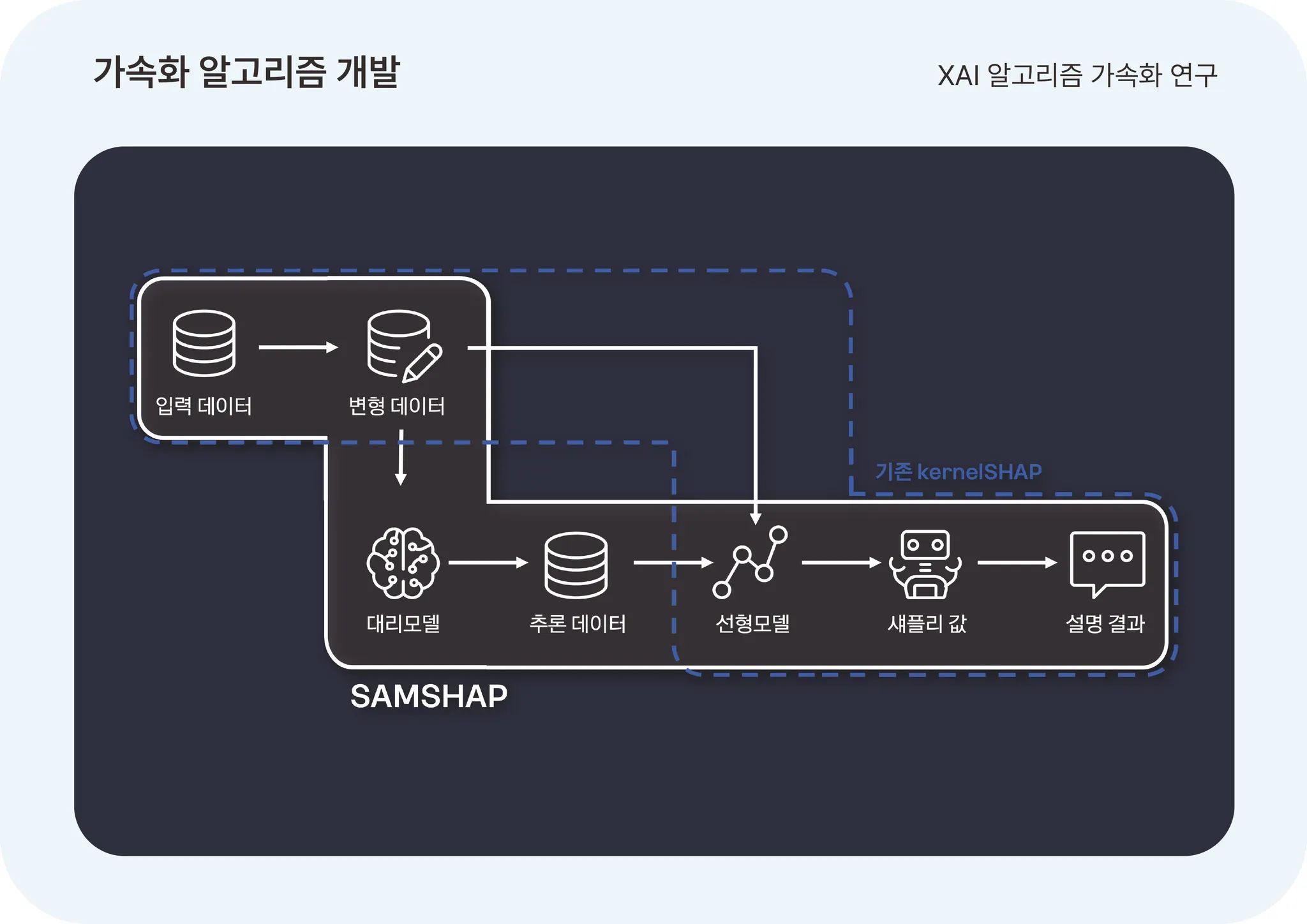 SAMSHAP은 KernelSHAP 알고리즘의 계산 시간을 더 가속화하기 위해, 배경데이터에 대한 연산을 1번만 계산하도록 미리 대리 모델을 학습시키는 방법론입니다. 이때, 배경 데이터에 대한 계산 이외에 “선형 회귀 모델”의 계수를 새플리값으로 이용해 설명 결과를 도출한다는 점에서 기존 KernelSHAP의 설명력을 더욱 유지시킬 수 있습니다.