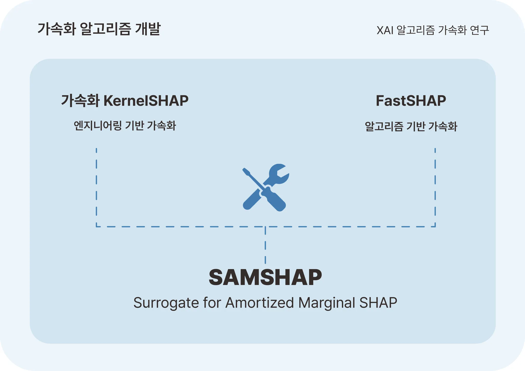 XAI 가속화 알고리즘의 가장 대표적인 방법론으로 FastSHAP이 있습니다. FastSHAP은 속도는 매우 빠르게 가속화할 수 있다는 장점이 있지만, 기존 설명결과를 보존하기 어렵다는 단점이 있습니다. 위에서 언급했던 가속화된 KernelSHAP이 가지는 속도적인 단점과 FastSHAP이 가지는 정확도 측면에서의 단점을 함께 보완한 SAMSHAP을 개발했습니다.