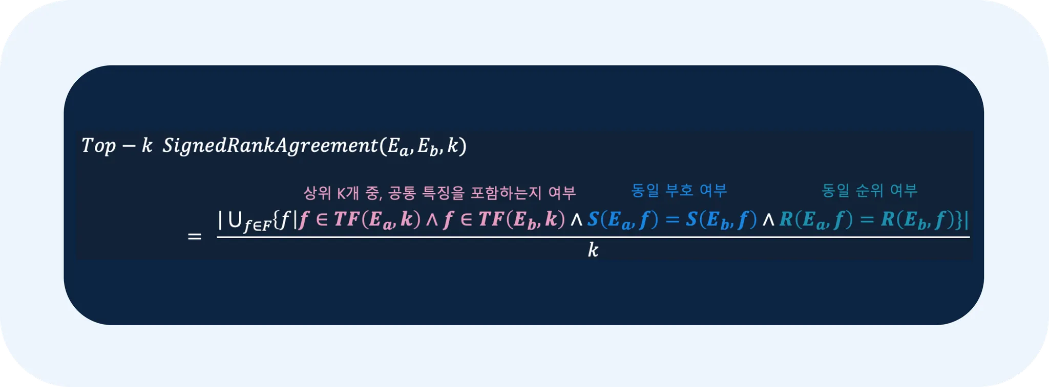 상위 3개 주요 특성(Feature)에 대해 순위와, 부호의 일치를 평가하는 값입니다. 기존 가속화 대상 XAI 알고리즘인 KernelSHAP(a)와 가속화가 적용된 모델(b)에 대한 설명결과로 추출된 상위 3개 특성을 비교하여, 순위와 부호가 모두 동일한 특성들의 비율을 계산합니다. 해당 값은 상위 3개 특성 결과가 일치해야하기 때문에 매우 보수적으로 정확도를 계산할 수 있습니다.