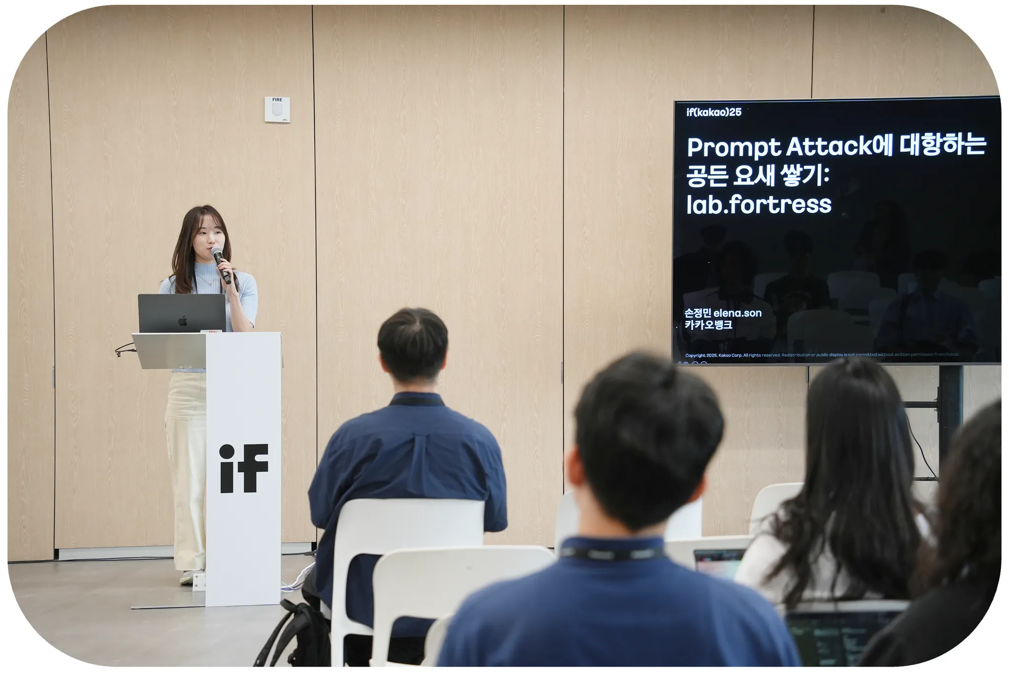 이프카카오는 카카오 그룹의 기술 비전과 연구 성과를 공유하는 연례 행사로, 한 해 동안 집중해 온 기술적 도전과 성과를 개발자 커뮤니티와 함께 나누는 자리입니다. 올해 행사에서는 카카오뱅크 내에서 금융기술연구소가 단독으로 발표 세션에 참여하여, ‘기술 너머의 가능성’이라는 주제 아래 프롬프트 어택(Prompt Attack) 탐지 모델 개발기를 소개했습니다.