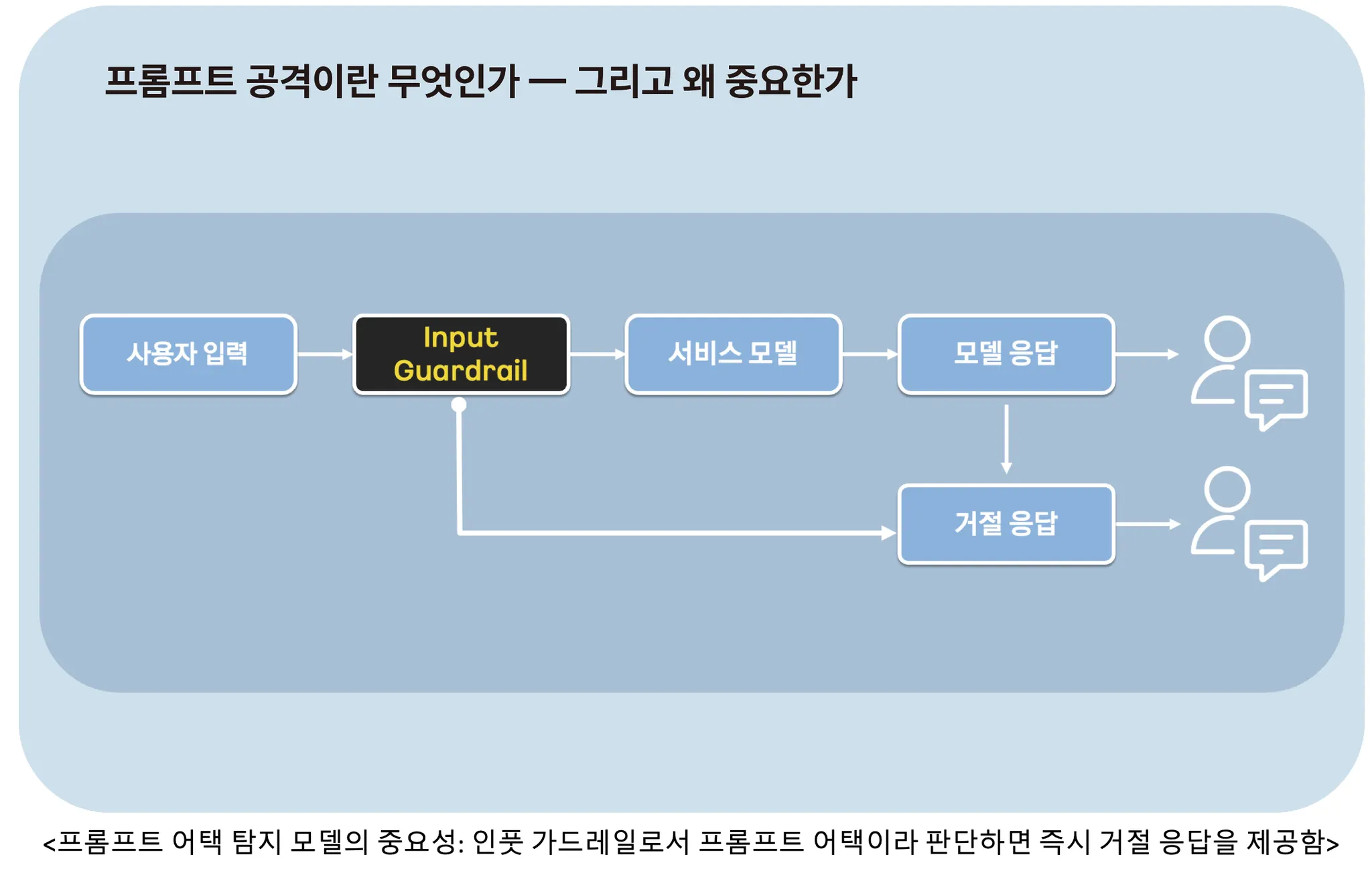 하지만 공격은 점점 더 정교한 형태로 발전하고 있습니다. 이에 저희 기술연구소는 후속 연구로 멀티턴 인풋 가드레일과 아웃풋 가드레일 연구를 진행 중입니다. 멀티턴 인풋 가드레일은 여러 차례의 대화를 종합적으로 분석하여, 대화 맥락 속에 숨은 공격을 탐지할 수 있게 합니다. 또한 아웃풋 가드레일은 사용자 입력과 모델의 응답까지 함께 판단하여, 결과적으로 안전한 응답만 사용자에게 노출되도록 설계됩니다.