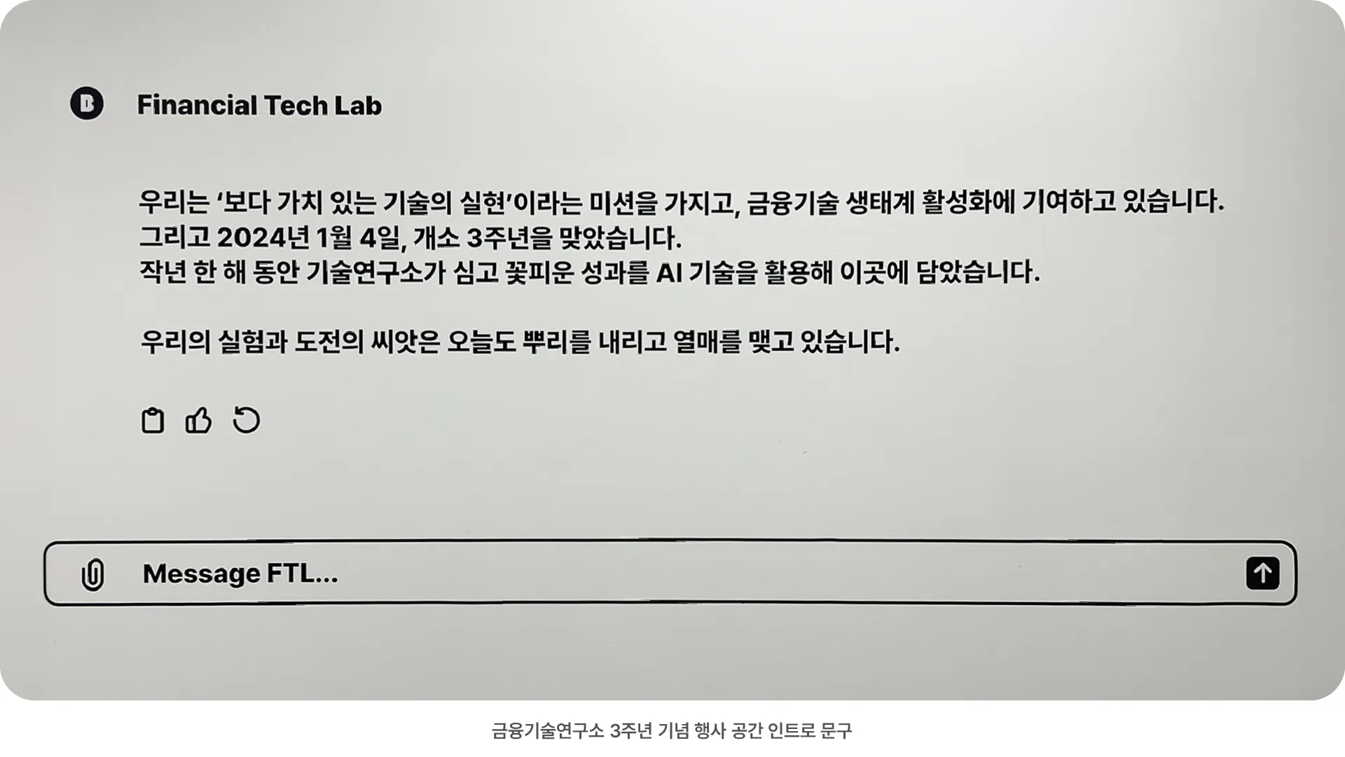 금융기술연구소에게 2023년은 새로운 한계에 도전했던 시도들이 하나씩 결실을 맺기 시작한 시점이었습니다. 내부적으로는 여전히 해결해야 할 기술 난제가 산재해 있고 금융산업 테두리 안에서 신기술 혁신을 추구해 가는 과정이 순조롭지 않았으나, 그동안 심혈을 기울여 노력해 왔던 요소들이 카카오뱅크 내부는 물론 외부에서 인정받을 수 있었습니다. 앞으로 카카오뱅크가 비대면 고객 인증, 문서 OCR, 신용평가, 이상거래탐지, 챗봇 분야는 국제적인 우위를 확고히 할 수 있도록 계속 뒷받침하고, 금융기술연구소만의 특색과 출중함을 돋보일 수 있는 연구분야를 개척하기 위해 최선을 다해 나갈 것입니다.