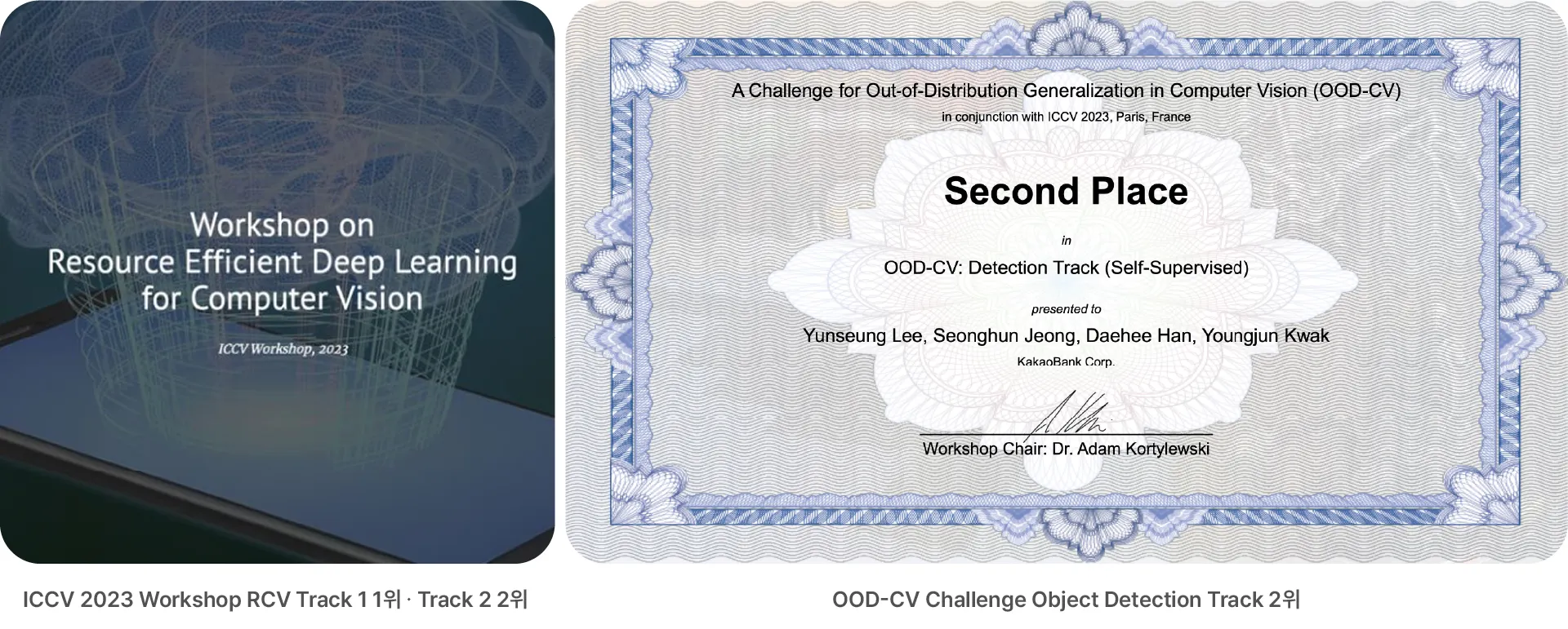 작년에 이룬 성과 중 값진 경험은 챌린지 형식 경진대회(Challenge / Competition)에 참가해 걸출한 성적을 기록하기 시작한 것입니다. 전 세계 유수 대학, 연구기관과, 전문 기업들이 함께 참여하는 대회와 리더보드는 비슷한 연구 주제를 수행하고 있는 집단 간 수준 격차를 가늠해 보고 실용적인 성능 개선 노하우를 익힐 수 있는 측면에서 유용합니다. 연구소는 ICCV 2023 학회에 논문을 발표하면서 부대 워크숍으로 열린 챌린지 대회에 도전했고, 4개 부문에서 최상위권(우승 및 준우승)에 입상하는 결과를 얻었습니다. 특히 최종 우승한 RCV 워크숍에서는 중국 핀테크 Ant Group 등 카카오뱅크보다 훨씬 규모가 큰 빅테크들과 어깨를 나란히 했다는 점이 고무적이었습니다.