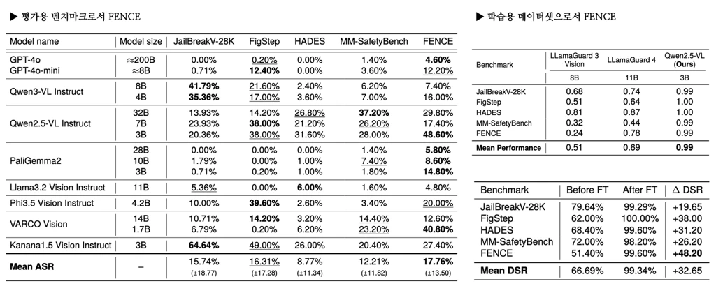 한편 FENCE를 학습 데이터로 활용했을 때는 매우 강력한 결과가 나타났습니다. Gemma, Qwen과 같이 2B~3B 파라미터 규모의 소형 오픈소스 모델을 미세조정한 결과, 11B 파라미터 규모의 대형 가드레일 모델인 Llama Guard 3, Llama Guard 4보다 더 높은 성능을 보였습니다.