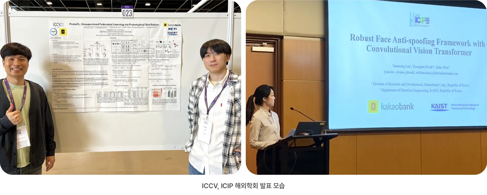 이 중에서 특히 인증 분야는 지난해 컴퓨터 비전 최상위권 학회인 ICCV, ICASSP, ICIP에서 세 차례 논문을 발표함으로써 세계적인 빅테크 및 금융사들과 어깨를 나란히 했습니다. 해외 학회에 나가보니 은행이 고객 인증과 위조 방지 기술을 자체적으로 개발하고 있다는 사실에 놀라워하며, 실성능과 연구 개발 환경에 많은 관심을 받았습니다. 적어도 카카오뱅크가 금융사 중에 비대면 기술 투자와 실제 운영 사례 확보에 매우 앞서있다는 것을 확인할 수 있는 소중한 경험이었습니다.