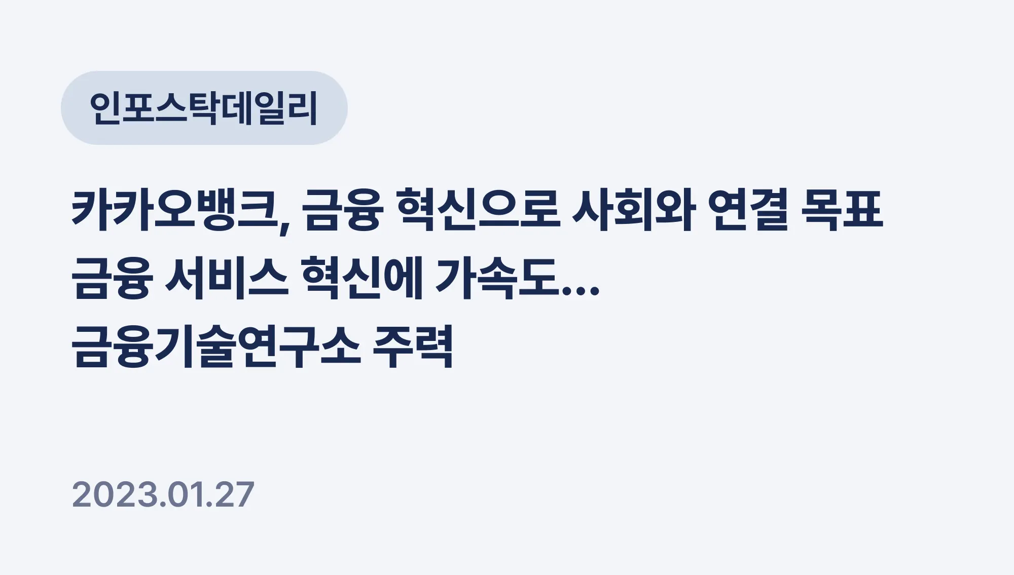 카카오뱅크에 연구소가 있다는 사실, 알고 계신가요? 2021년 1월 4일 문을 연 ‘금융기술연구소’가 그 주인공입니다! 카카오뱅크는 오픈 이래로 기술로 은행을 엔지니어링 하며, 편리하고 유용한 서비스를 만들어왔습니다. 그렇기에 한 발 앞선 기술력은 우리에게 중요한 역량 중 하나인데요. 앞으로도 금융생태계의 문제를 기술로 해결하고 더 큰 혁신을 만들어 가기 위해 카카오뱅크는 금융기술연구소에서 빠르고 깊이 있게 기술을 다루고 있답니다. ⋯⋯ 원문 읽기>