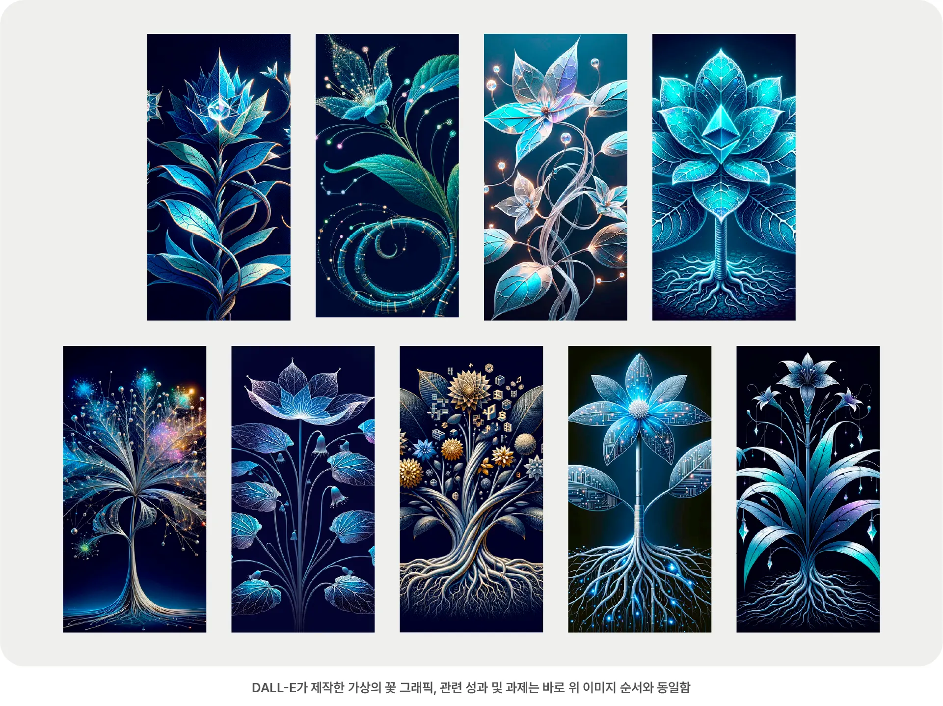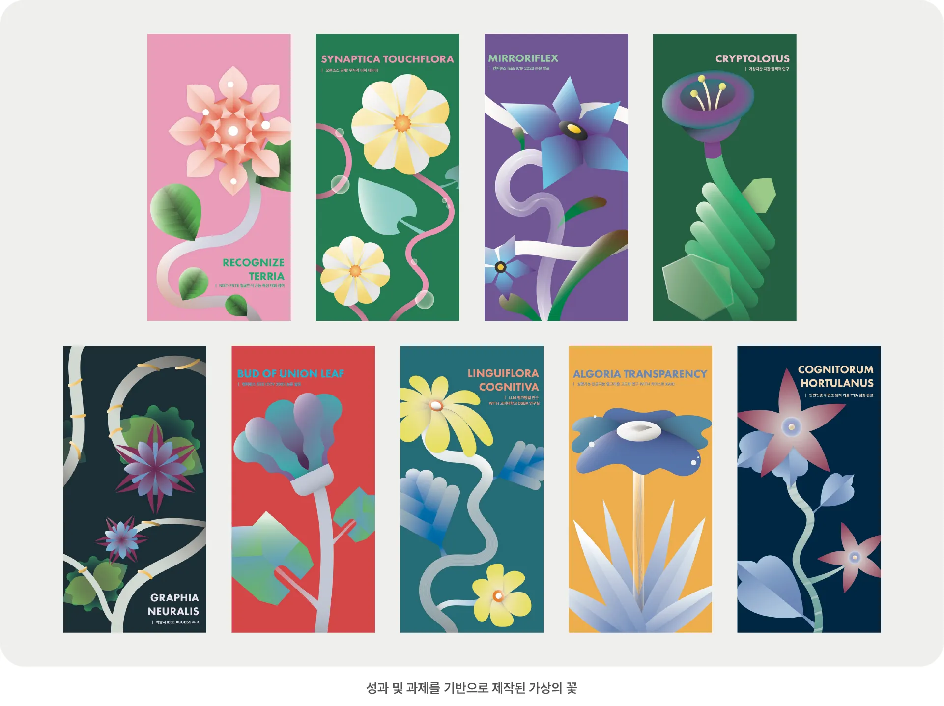 Vida가 <Seedning>을 준비하면서 가장 중점을 두었던 것은 비전공자에게 난해할 수 있는 연구개발 내용을 알기 쉽게 전달하는 것이었습니다. 고민 끝에 기술의 상세 내용을 일일이 설명하기보다, 시각화된 콘텐츠를 전시하기로 결정했습니다. 12대 성과를 가지고, 열두 송이의 꽃 그래픽과 다섯 개의 미디어아트를 선보였습니다. 키워드 추출, 코드 변환과 가상의 꽃 창작은 ChatGPT를 사용했고, 사람이 직접 제작한 그래픽과 DALL-E가 제작한 이미지를 함께 활용해 연구 결과물을 표현했습니다.