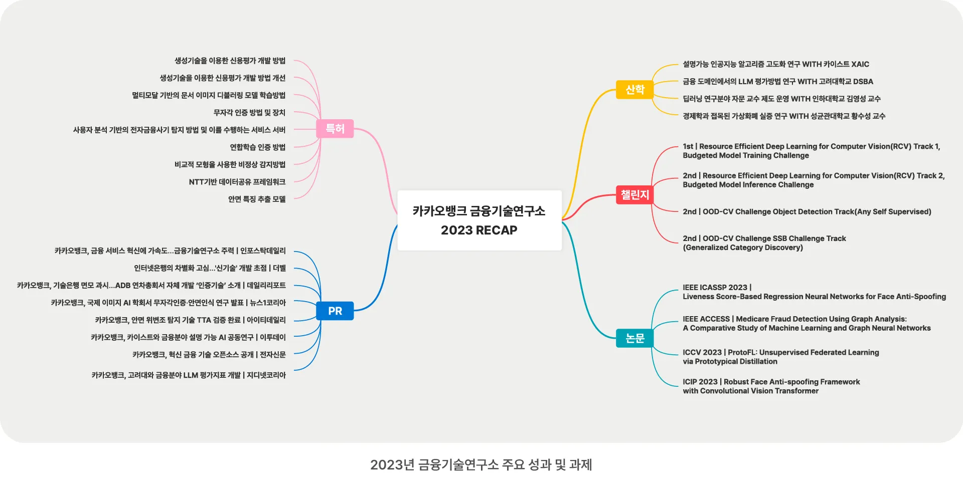 2023년은 금융기술연구소가 선진적이고 우수한 연구개발 환경 속에서 한 층 더 성장하는 해였습니다. 사업부서와 협업 연구를 본격적으로 시작하여 카카오뱅크 비즈니스 가치 창출에 기여하였고, 최근 가장 주목받고 있는 LLM 출현 시, 발 빠른 PoC로 카카오뱅크가 시기적절하게 대응할 수 있도록 지원했습니다. 이외에도 자문 계약과 산학 과제를 새롭게 체결하였으며, 챌린지 참여와 오픈소스 공개를 통해 카카오뱅크의 높은 기술력을 대외적으로 널리 알렸습니다.
