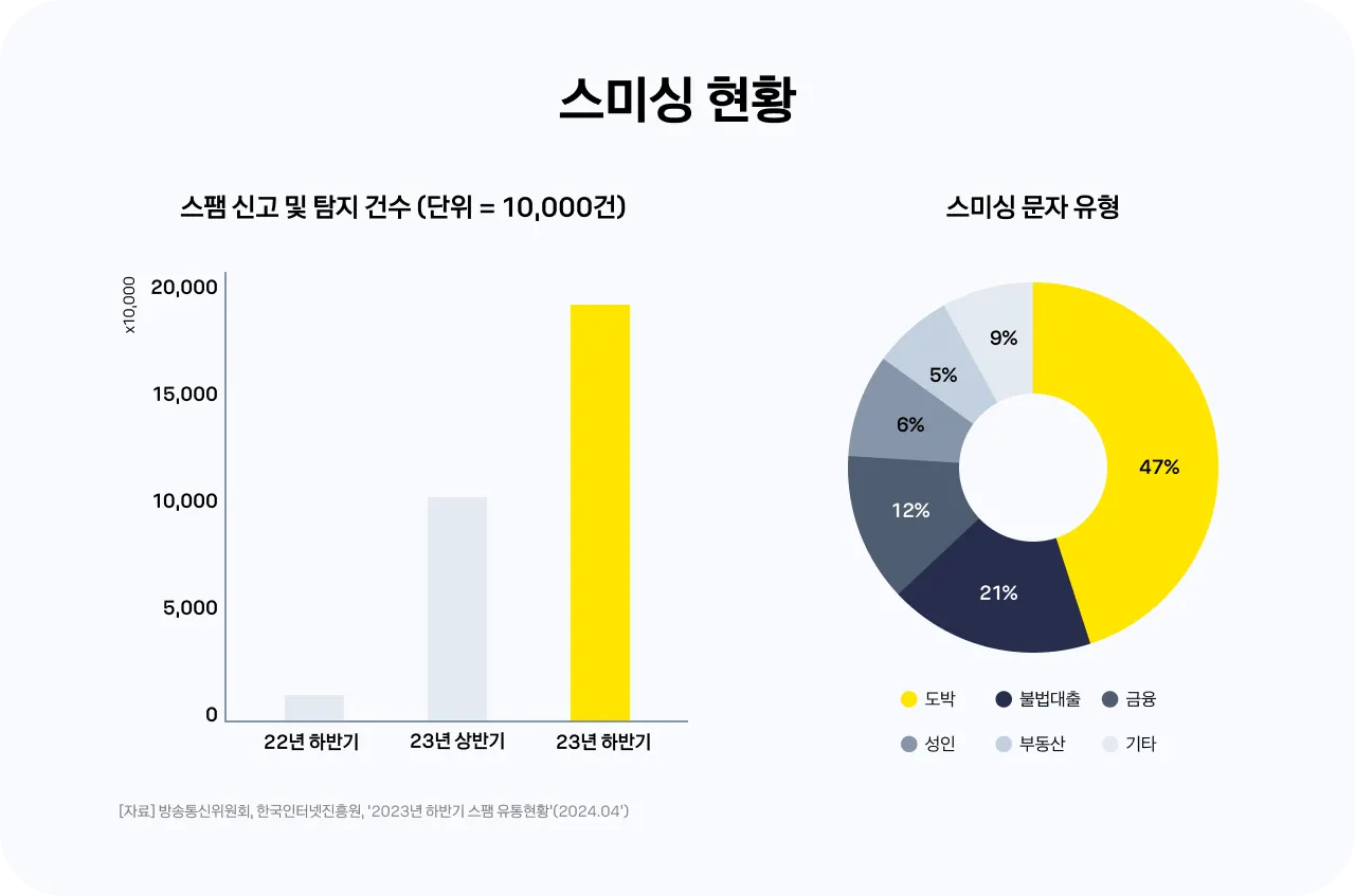 스미싱(Smishing)은 휴대폰 문자메시지(SMS)나 SNS로 가족이나 지인, 정부 기관을 사칭해 개인정보를 탈취해 2차 피해를 입히는 범죄입니다. 규제 당국의 자료에 따르면 스팸 메시지 건수는 상반기 대비 2배 가량 증가했습니다. 경찰청은 최근 2년간 스미싱 피해액이 600억 원 억원에 달할 것으로 전망했습니다. 특히 스미싱은 단순한 개인 정보 유출이나 소액 사기와 달리 불법 대출을 비롯한 금융 사기와도 연관이 많아 카카오뱅크에서는 AI로 이를 예방할 수 있는 방안을 고민해 왔습니다.