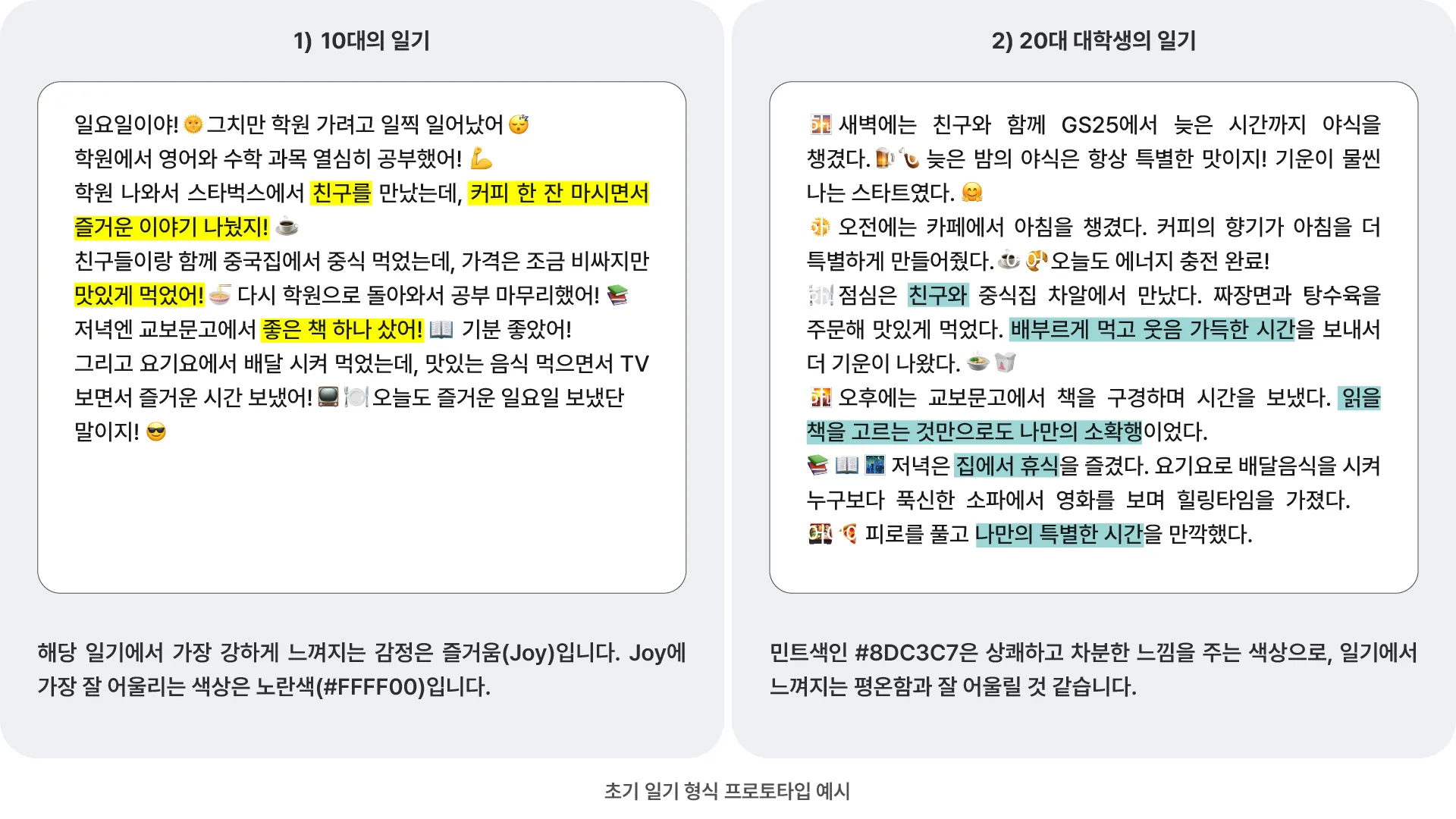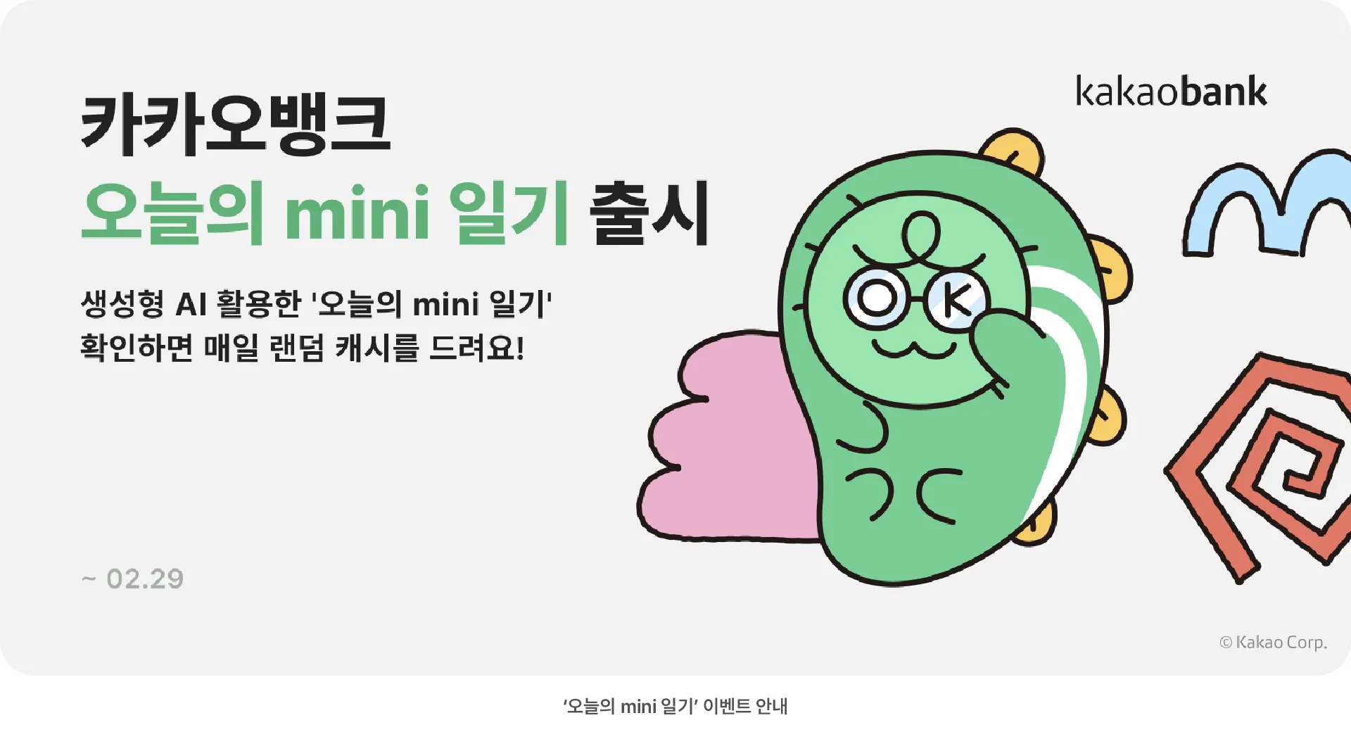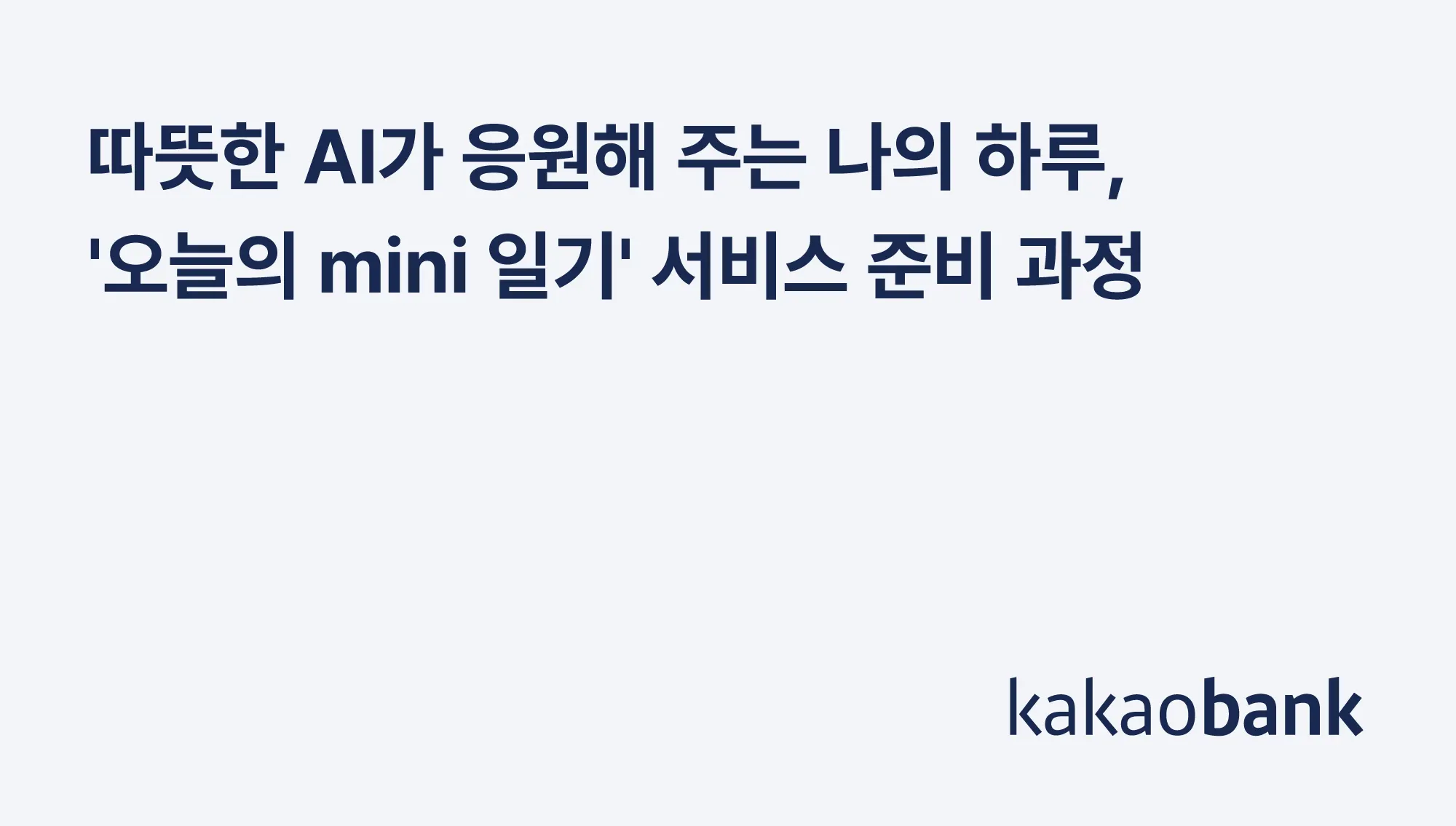 최근 카카오뱅크는 금융 서비스 분야에서 AI를 통해 이용자에게 새로운 경험을 제공하고 있습니다. 24년 1월 출시한 '오늘의 mini 일기'는 AI를 활용해 개발한 서비스 중 하나입니다. 카카오뱅크 mini는 만 7세 이상 18세 이하 청소년만 개설할 수 있는 선불전자지급수단으로 '오늘의 mini 일기'는 mini 카드를 이용하는 청소년 고객의 결제 이력을 분석해 자동으로 일기 형태의 글로 만들어줍니다. mini를 이용 중인 청소년이 1) 방학 중 아침에 게임을 사고 2) 고속버스를 예매한 상황을 상상해 보겠습니다. mini는 이용자의 결제 내역을 바탕으로 아래와 같은 일기를 써줍니다.